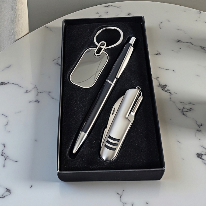 Практичен и стилен комплект, който комбинира полезното с елегантното. Перфектен избор за подарък с мъжки дух.